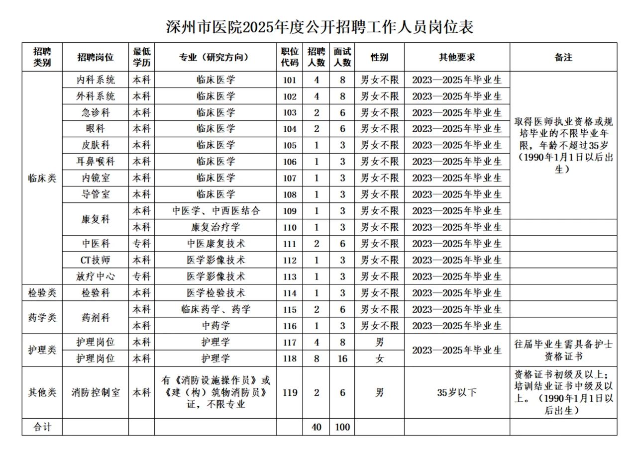 市医院公开招聘医护人员和其他工作人员40人,具体岗详见《深州市医院2025年度公开招聘工作人员岗位表》。