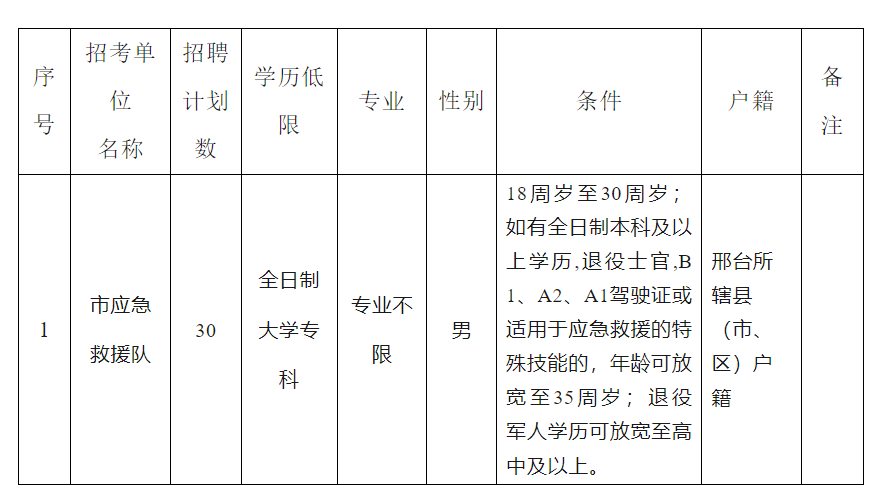 本次面向社会拟招聘编外工作人员30名。具体招聘岗位、人数、条件等情况见《邢台市应急救援队2025年度公开招聘编外工作人员岗位信息表》(附件,以下简称《岗位信息表》)。