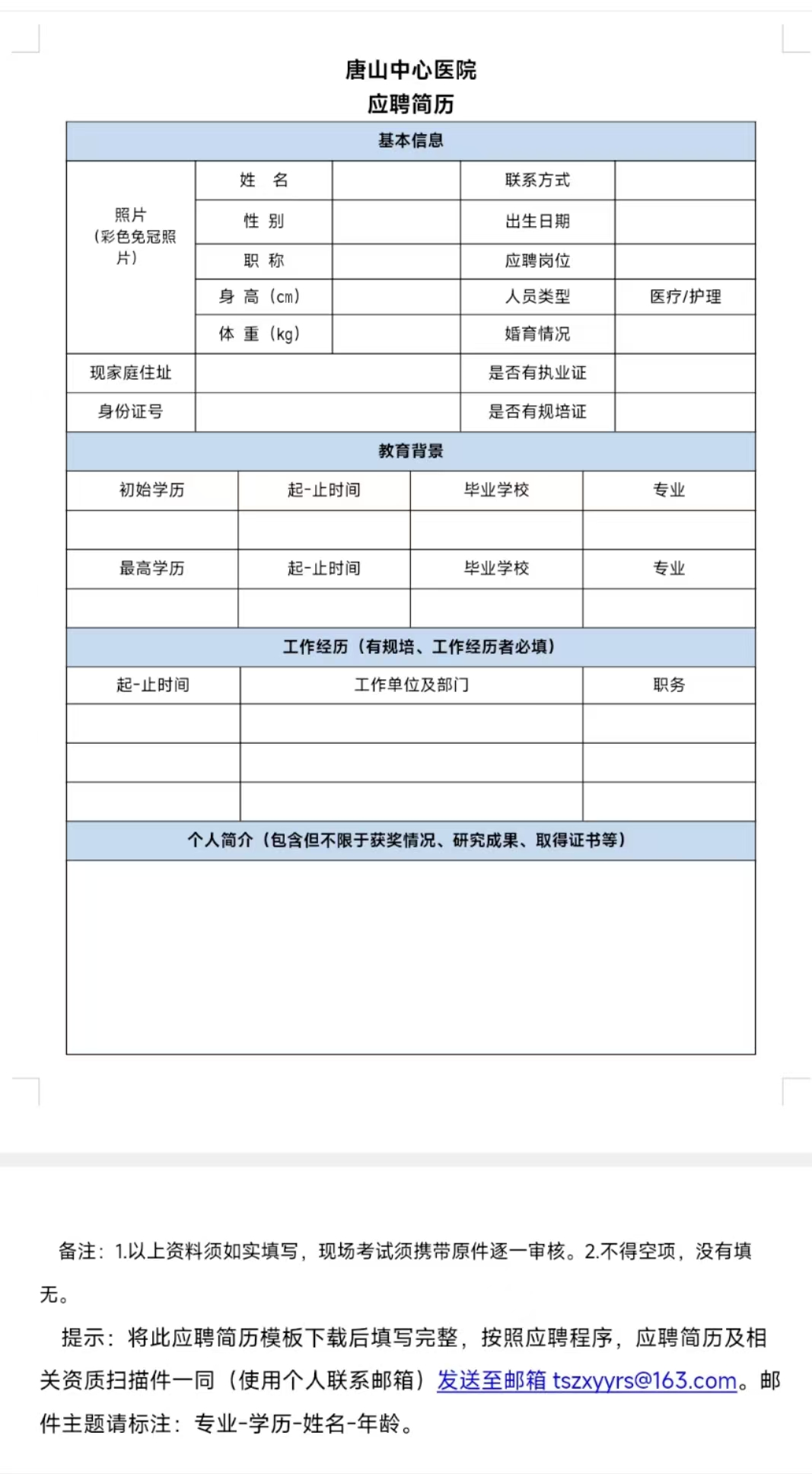 应聘材料:关注微信公众号(唐山中心医院),点击信息查询→招聘专区,下载报名登记表、简历模板,并按要求填写。或点击下方链接直接下载。
