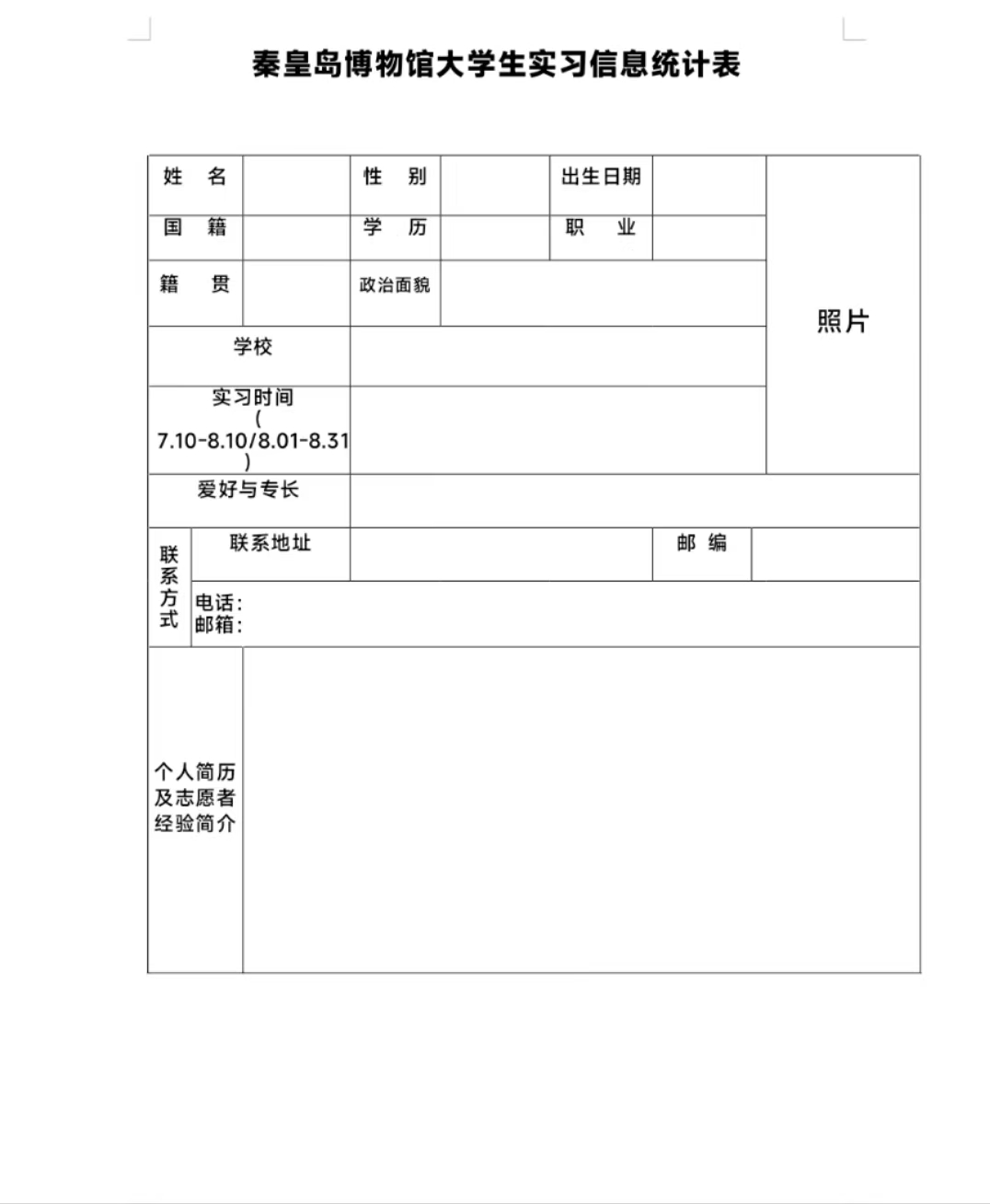 秦皇岛博物馆实习生申请表