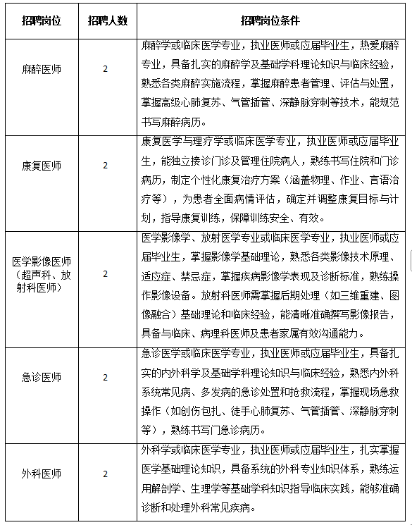 全日制统招本科及以上学历,专业为麻醉学、康复医学与理疗学、急诊医学、临床医学、外科学、医学影像学、超声医学、放射影像学。全日制专科(含专科起点本科),要求具备执业医师资格。
