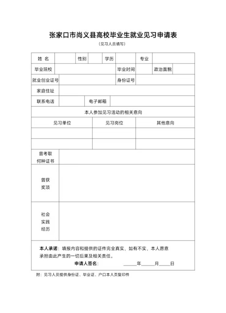 (一)报名材料:毕业证复印件、身份证复印件、户口本户主页和本人页复印件,以上材料各需一张;就业创业证(可下载河北人社APP进行登记办理);学信网学籍及学历证明(失业青年不提供);同时填写附件《青年就业见习申请表》。