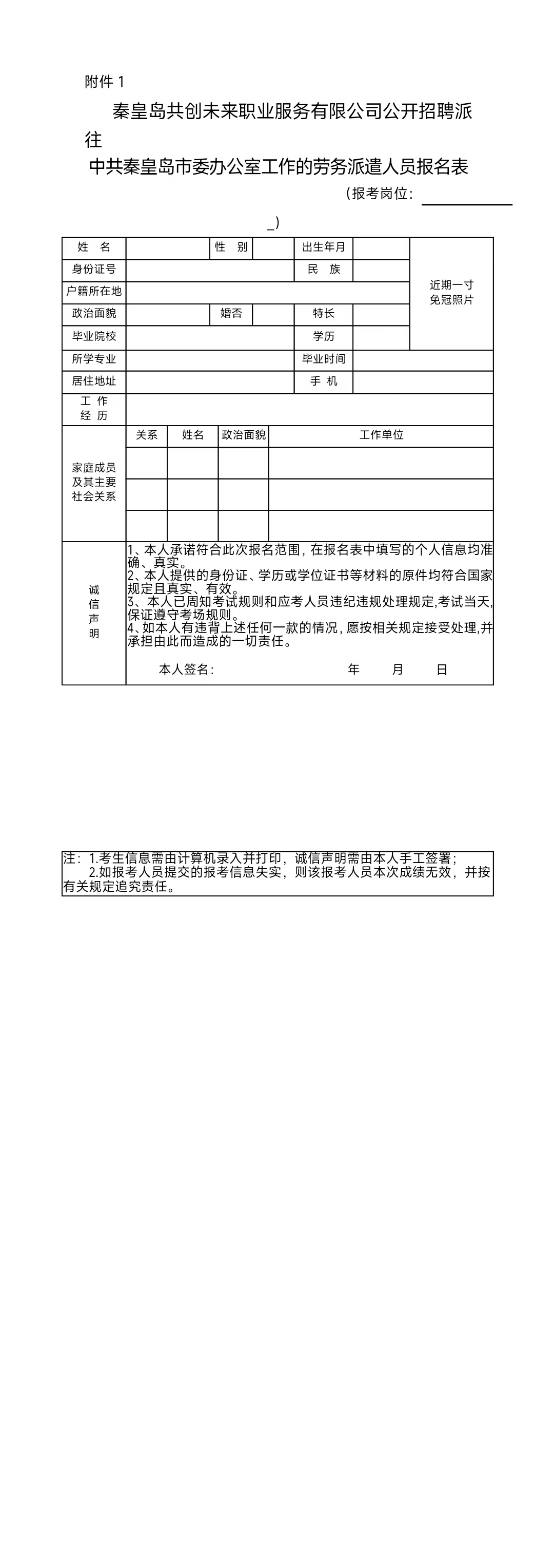 附件:1.秦皇岛共创未来职业服务有限公司公开招聘派往中共秦皇岛市委办公室工作的劳务派遣人员报名表