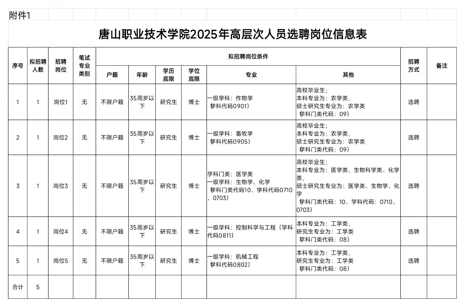 附件1:唐山职业技术学院2025年人才选聘岗位信息表