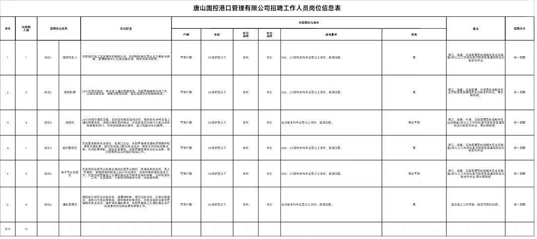 经研究决定,唐山国控港口管理有限公司面向社会公开招聘工作人员16名。现将有关事项公告如下: