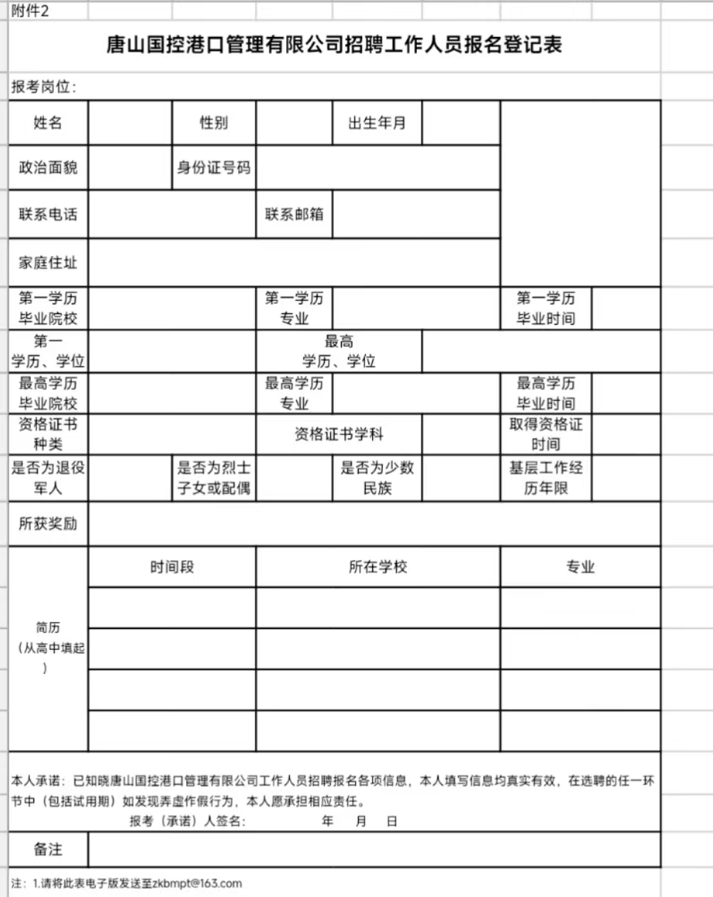 (3)《唐山国控港口管理有限公司岗位报名登记表》(附件2)电子版及本人签字的扫描件(需将近期彩色免冠小二寸证件电子照片插入表格内;含本人信息的内容要清晰可见),专科学历符合“岗位3”报名条件的,需在简历一栏填写工作经历,以方便工作人员审核。