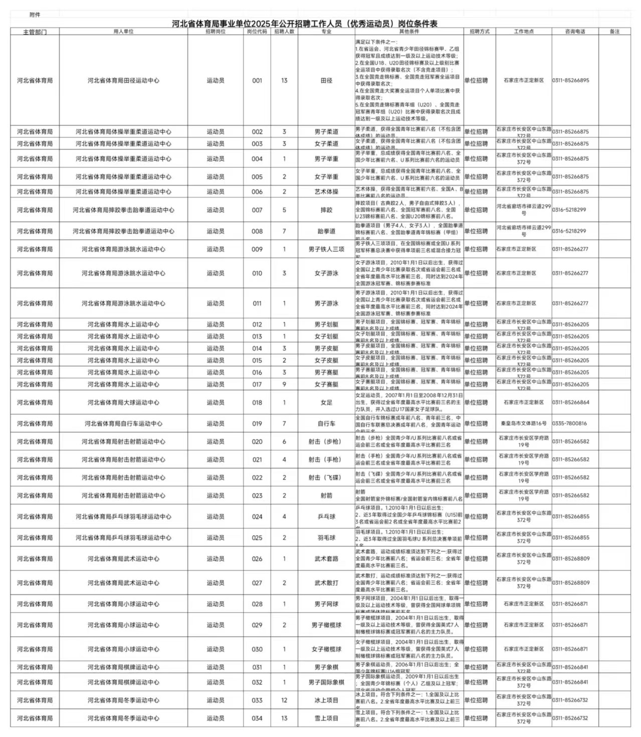 见《河北省体育局2025年公开招聘工作人员(优秀运动员)岗位条件表》。