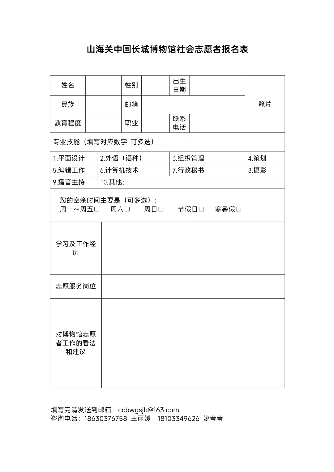 (一)填写山海关中国长城博物馆社会志愿者报名表后发送至邮箱ccbwgsjb@163.com(邮件主题命名为“志愿者报名+姓名”;报名时间为2025年6月19日--6月29日) 山海关中国长城博物馆社会志愿者报名表.docx