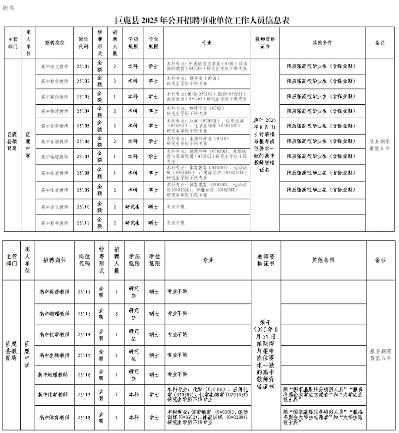 附件:《巨鹿县2025年公开招聘事业单位工作人员岗位信息表》