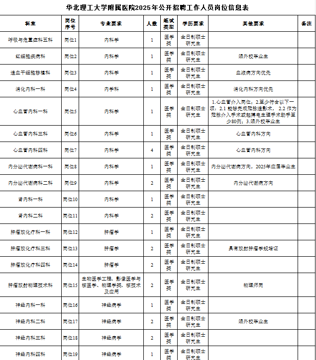 各岗位拟招聘人数、岗位条件等详见《华北理工大学附属医院2025年公开招聘工作人员岗位信息表》(以下简称《岗位信息表》)(见附件1)。