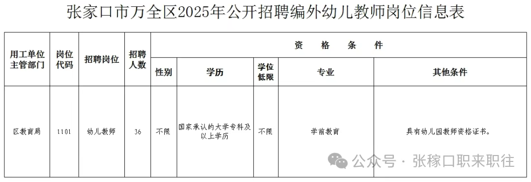 5、具备岗位所需要的其他资格条件。招聘岗位所需的具体条件按《张家口市万全区2025年公开招聘编外幼儿教师岗位信息表》(附件)要求确定。