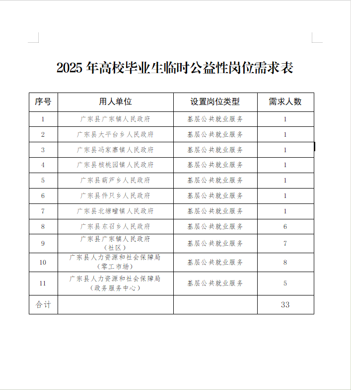 邢台广宗县2025年高校毕业生临时公益性岗位招聘33人公告