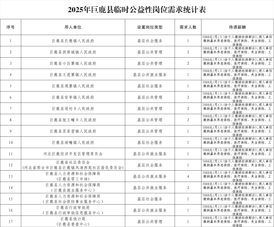 巨鹿县2025年高校毕业生临时公益性岗位招聘公告