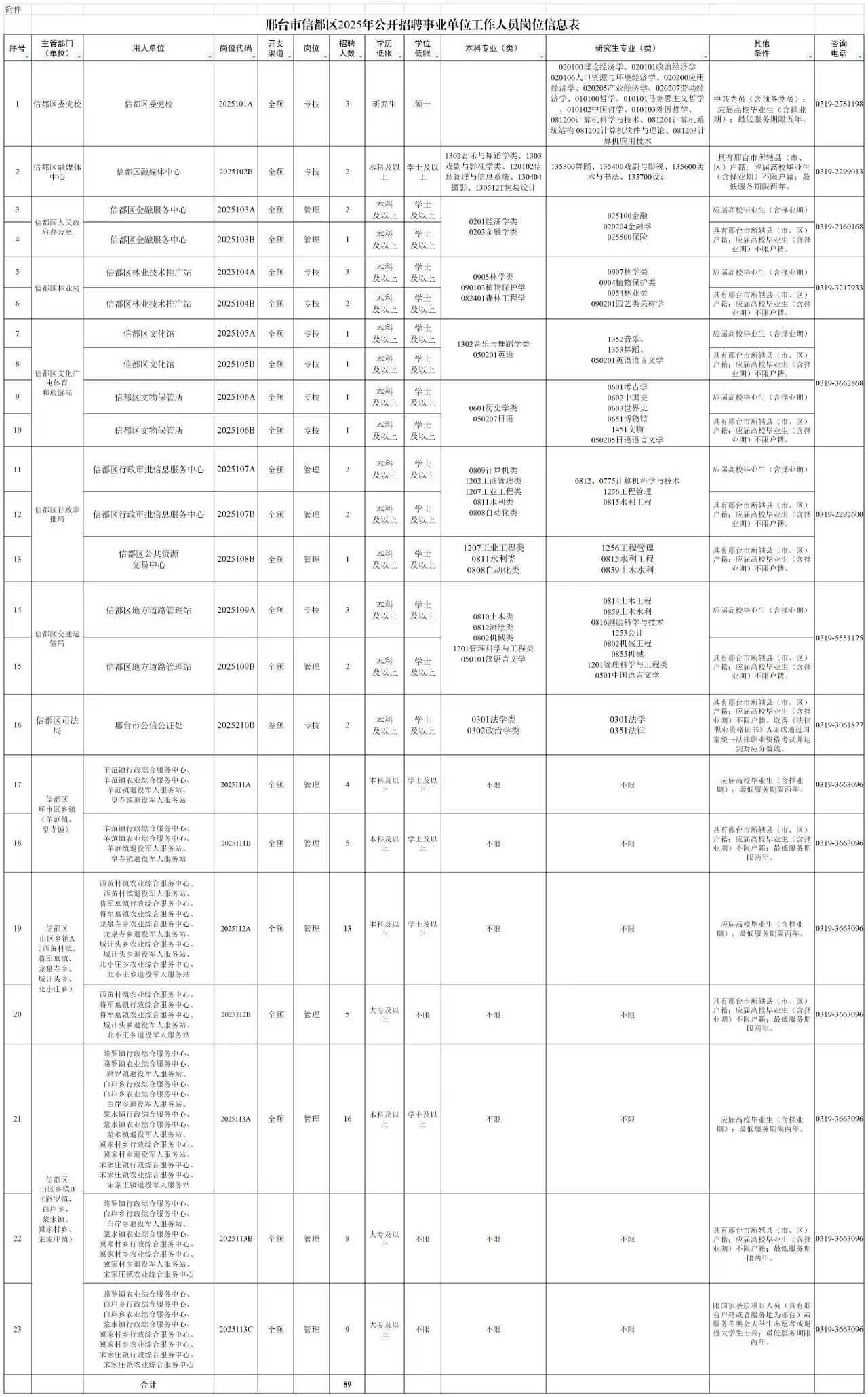 本次招聘事业单位工作人员共89名,各招聘单位招聘人数、具体岗位详见《邢台市信都区2025年公开招聘事业单位工作人员岗位信息表》(详见附件,以下简称《岗位信息表》)。