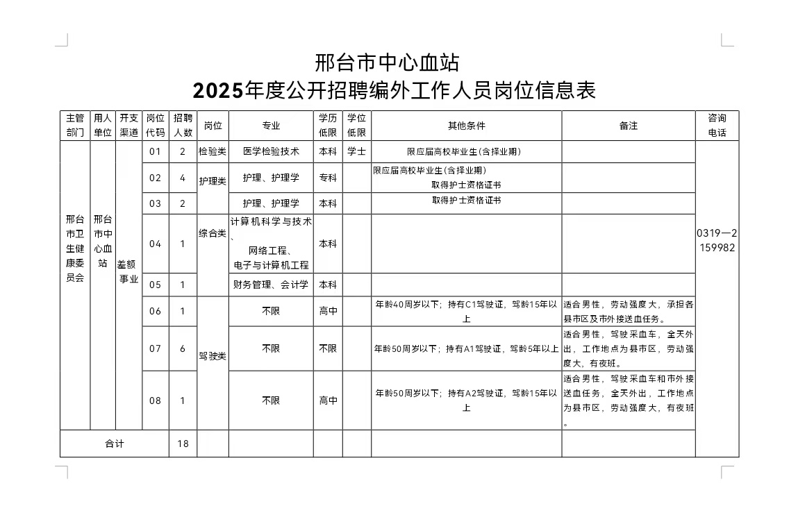 邢台市中心血站拟公开招聘工作人员18名。详见《邢台市中心血站2025年度公开招聘编外工作人员岗位信息表》。
