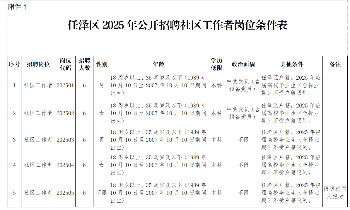 具体招聘人数和岗位条件详见《任泽区2025年公开招聘社区工作者岗位条件表》(附件1)。