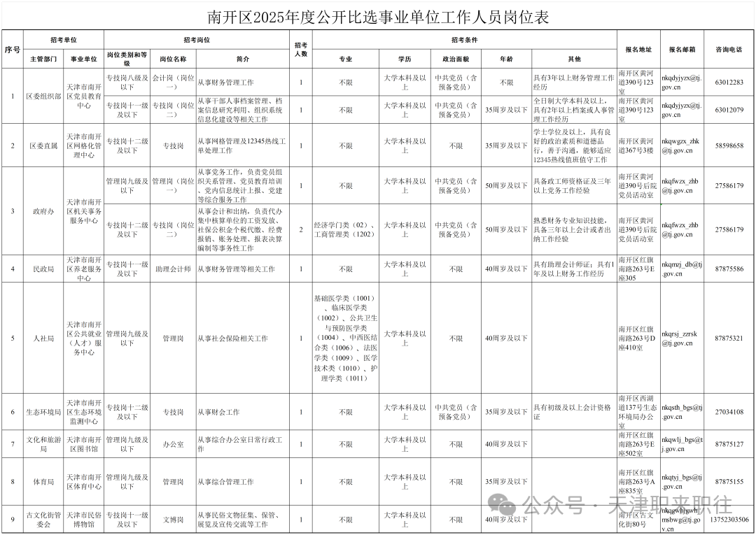 比选岗位、数量和资格条件等内容可查询《南开区2025年度公开比选事业单位工作人员岗位表》。