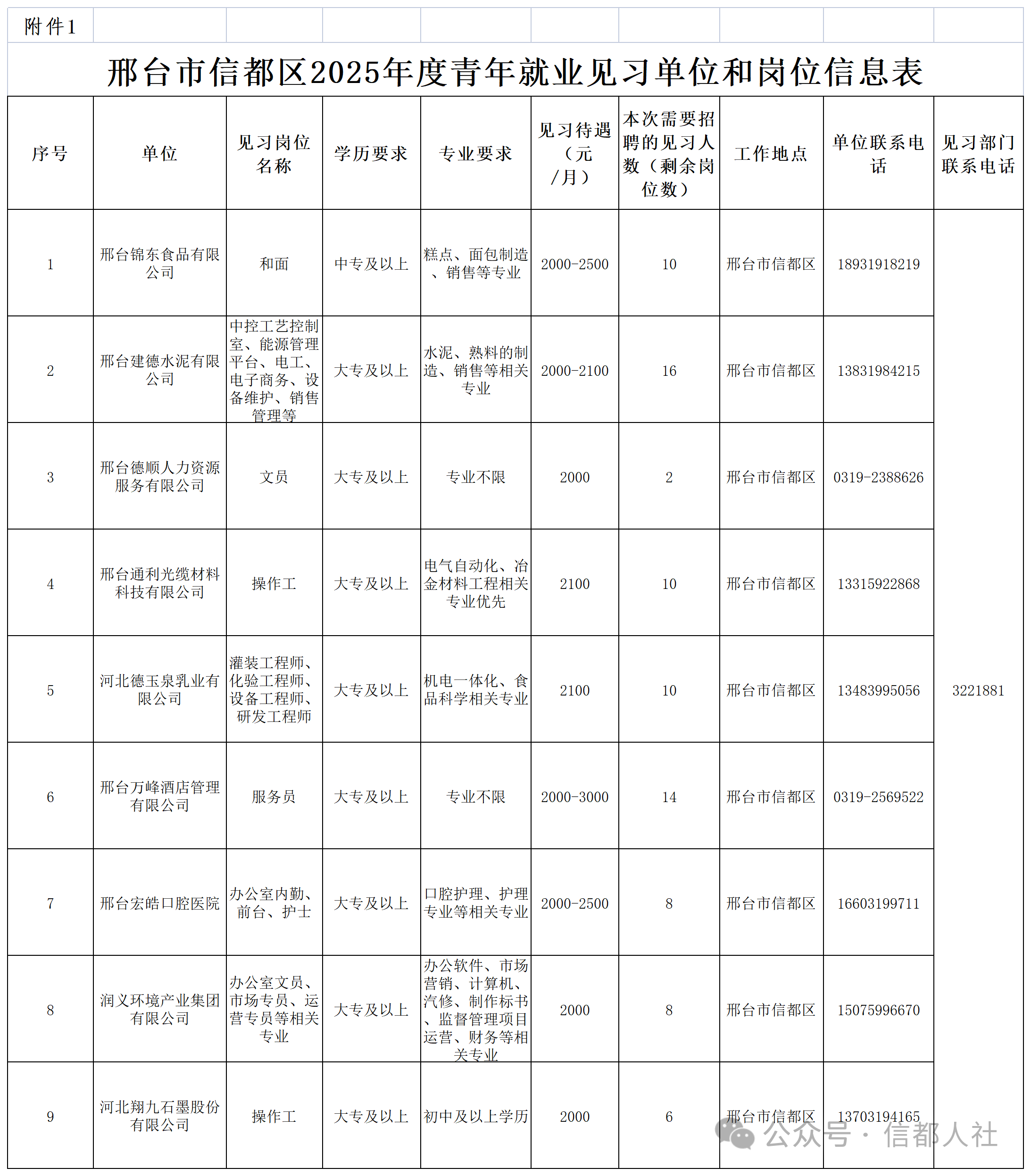 附件1:邢台市信都区2025年度青年就业见习单位和岗位信息表